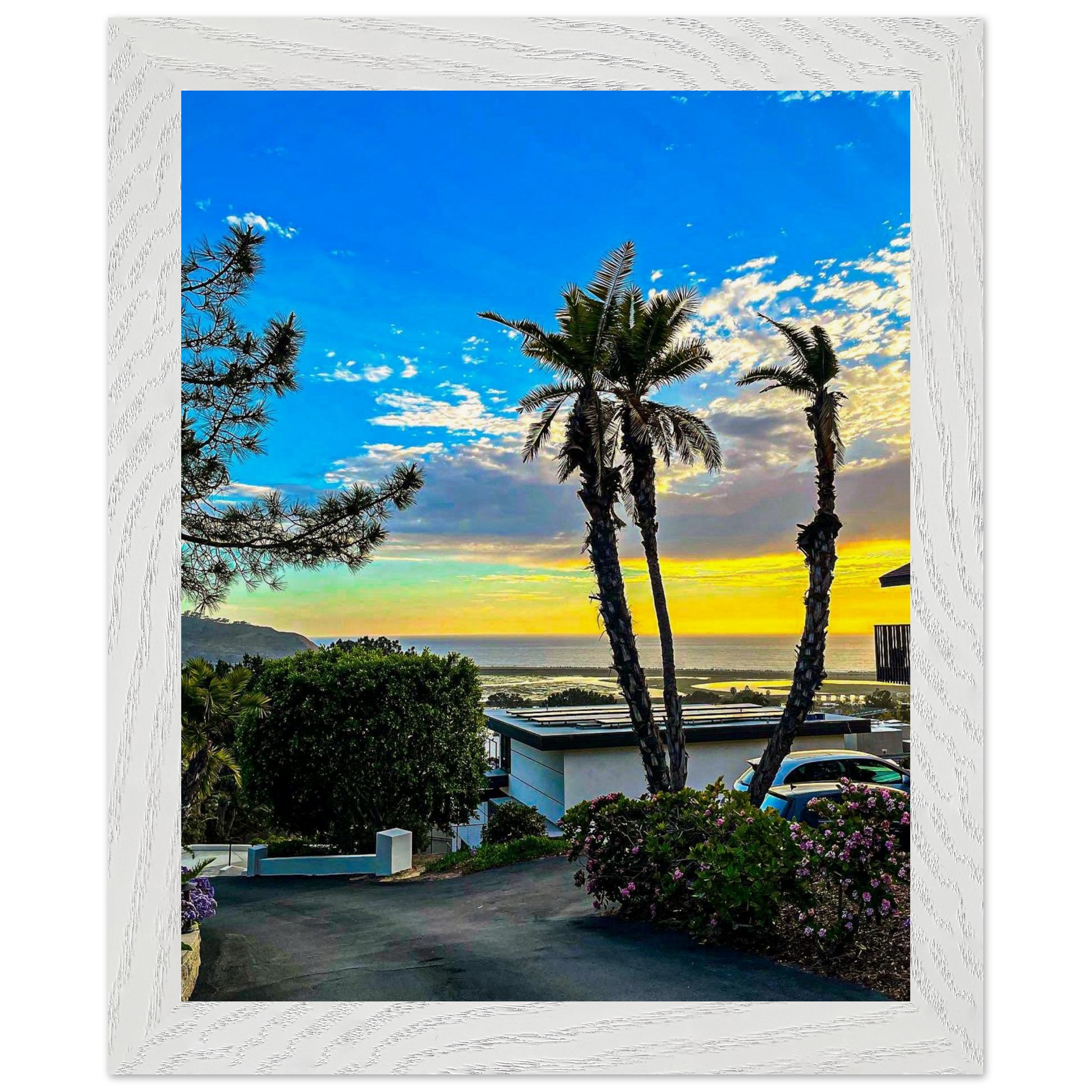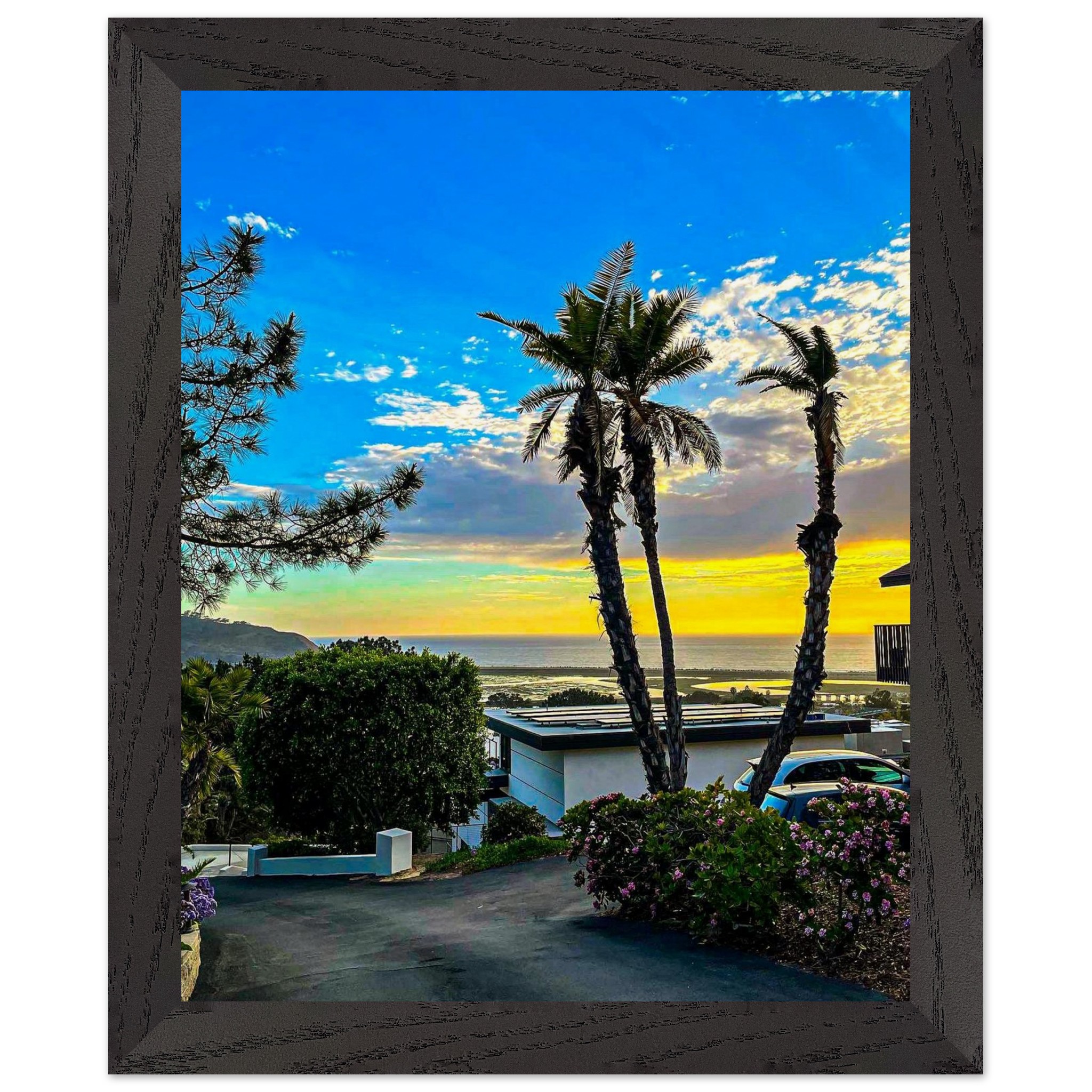 Immerse yourself in the vibrant spectacle of ‘Coastal Radiance,’ a framed poster capturing a breathtaking Pacific sunset. This piece paints the sky in vivid blues and electric yellows, framed by the iconic silhouettes of palm trees and a tranquil ocean vista. It’s a daily invitation to unwind, reflect, and bask in the serene glow of nature’s masterpiece.