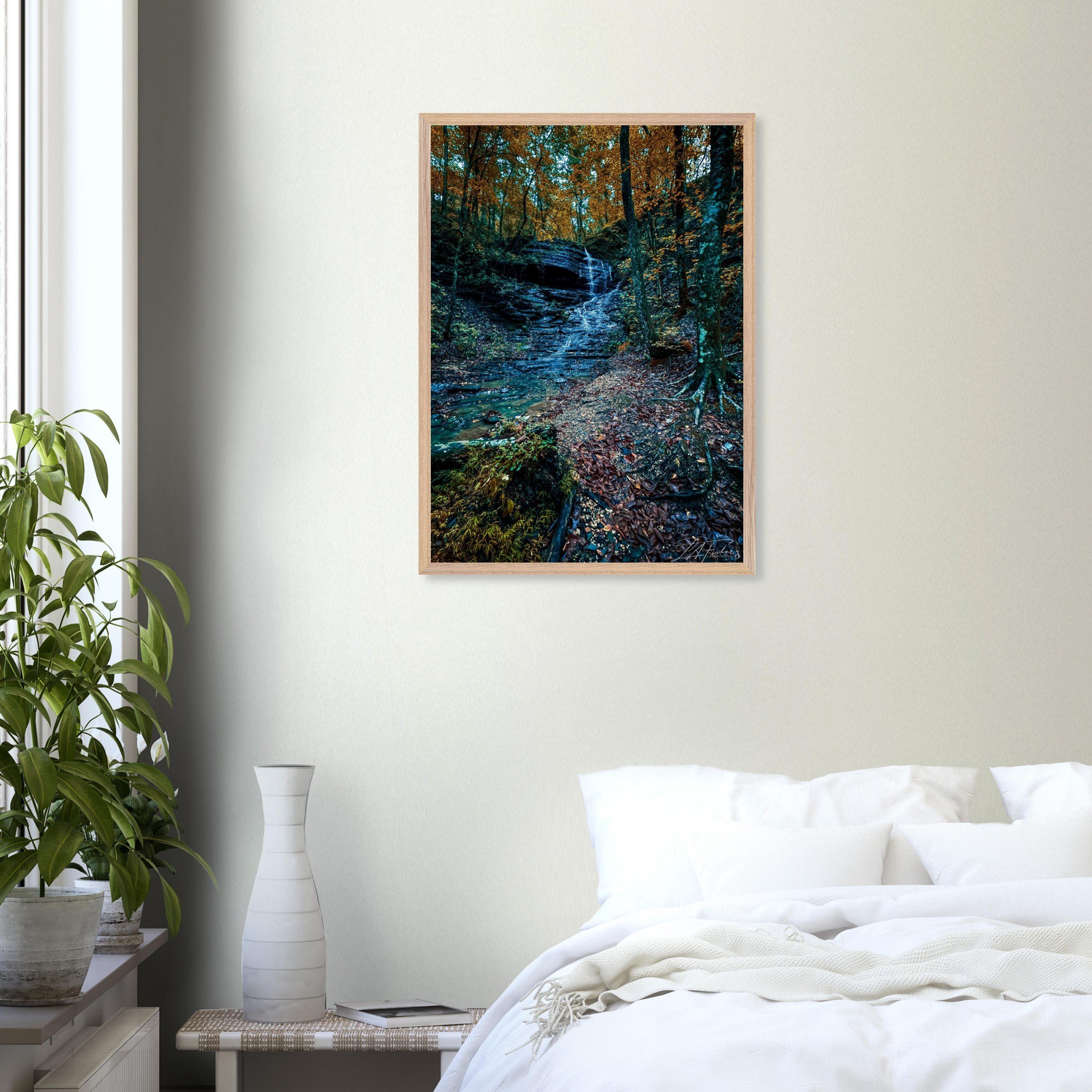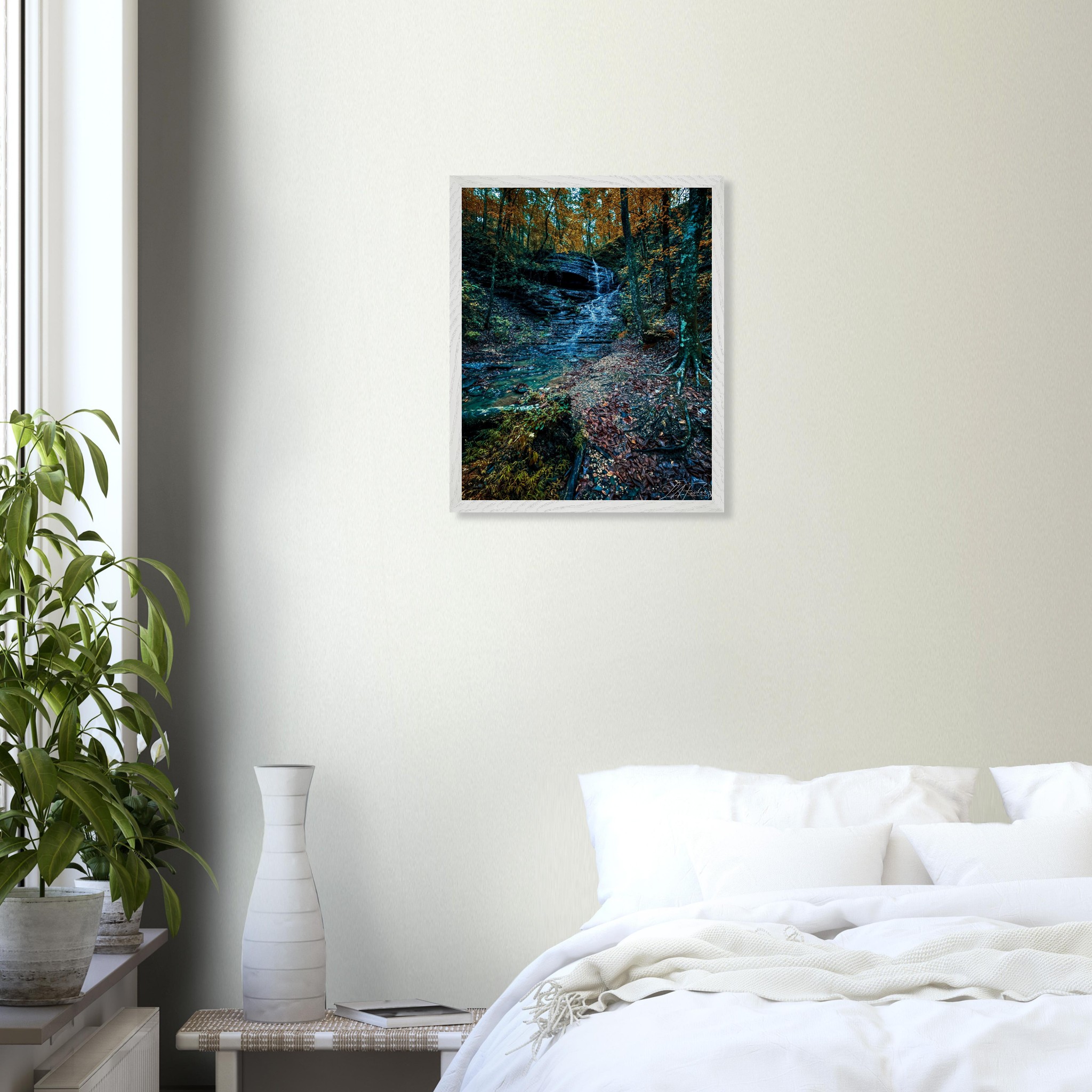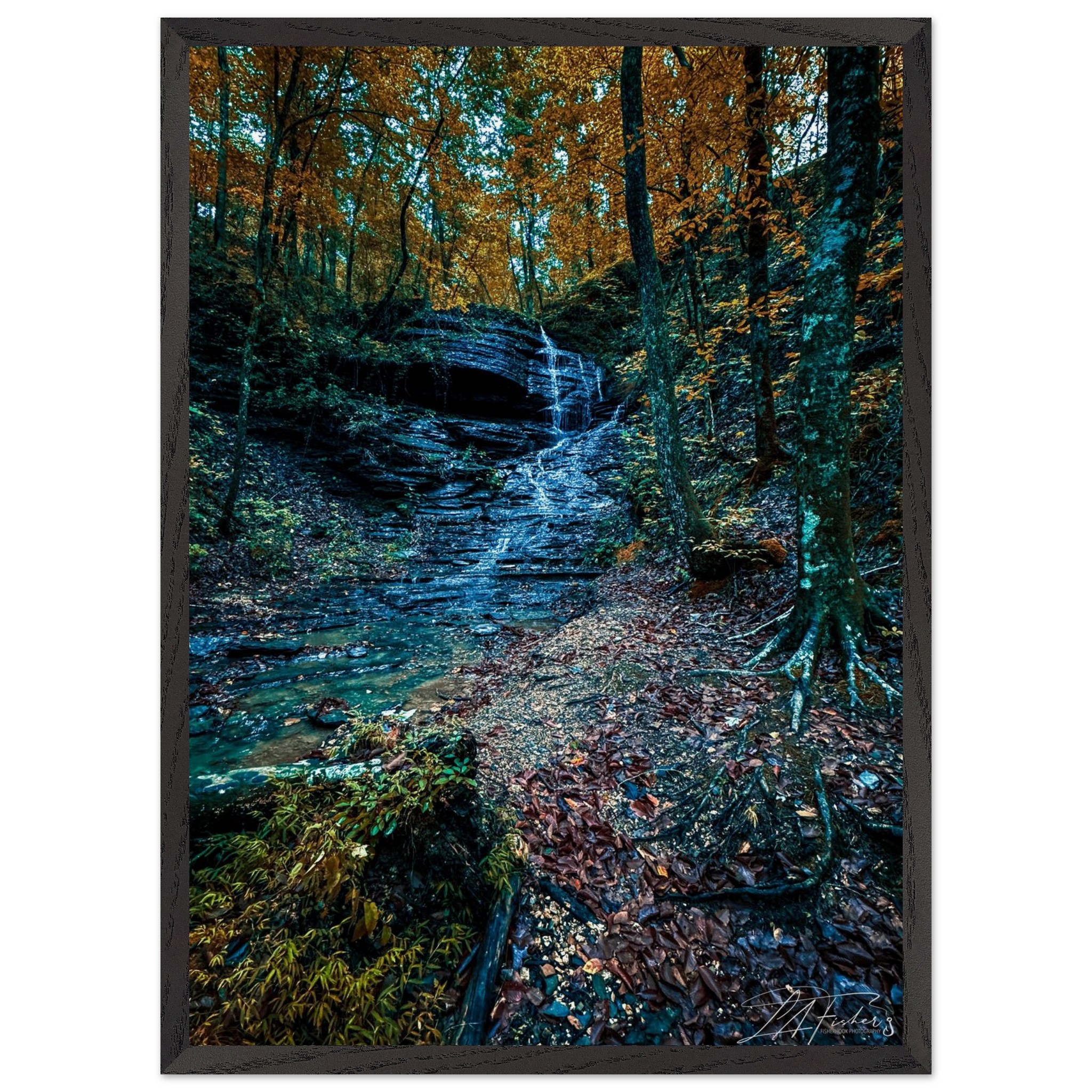 Step into a hidden realm where nature’s magic unfolds. ‘Enchanted Forest Falls’ captures a serene waterfall cascading through an autumn forest, bathed in ethereal light, with a captivating blend of deep blues and vibrant oranges. This piece embodies the quiet wonder of creation and invites reflection on the beauty found in unexpected places. A perfect addition for inspiring tranquility in your space.