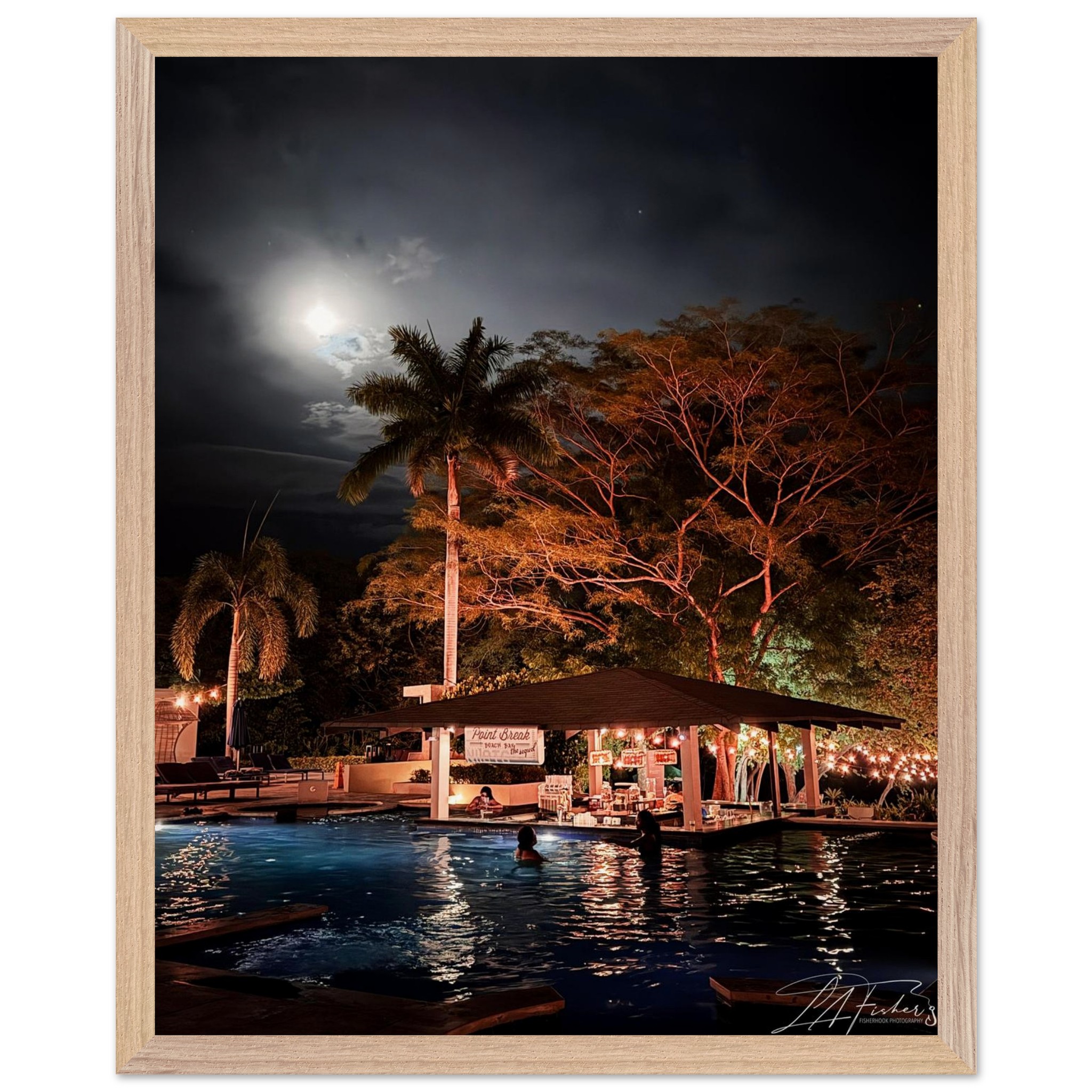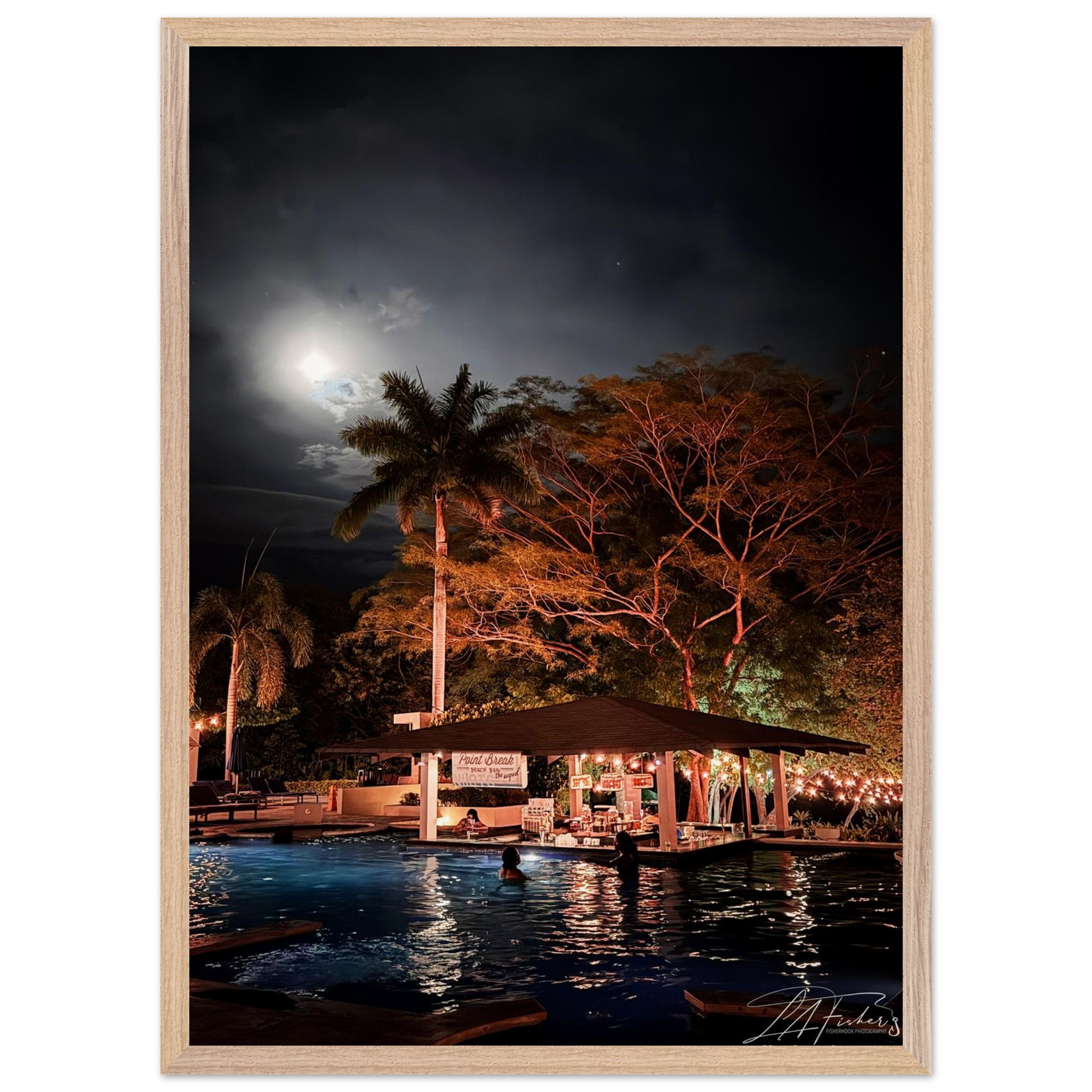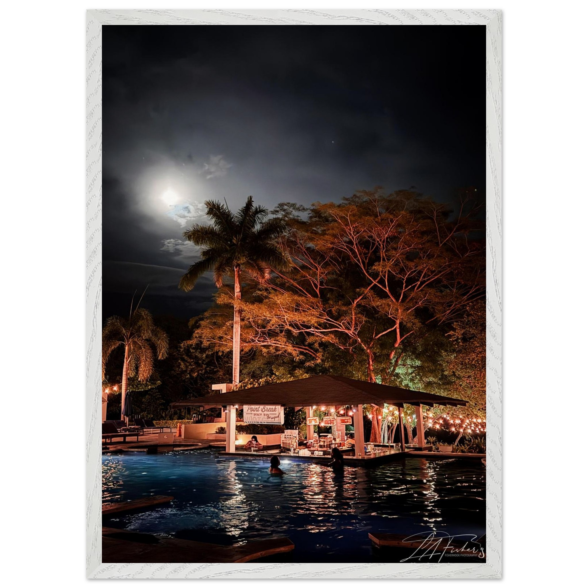 Escape to a tranquil tropical night with our ‘Moonlit Oasis’ framed poster. This captivating piece brings the serene glow of a full moon reflecting on a shimmering pool, surrounded by lush palm trees and the warm ambiance of string lights, right into your home. It’s an invitation to unwind, evoking the peaceful luxury of a perfect evening getaway.