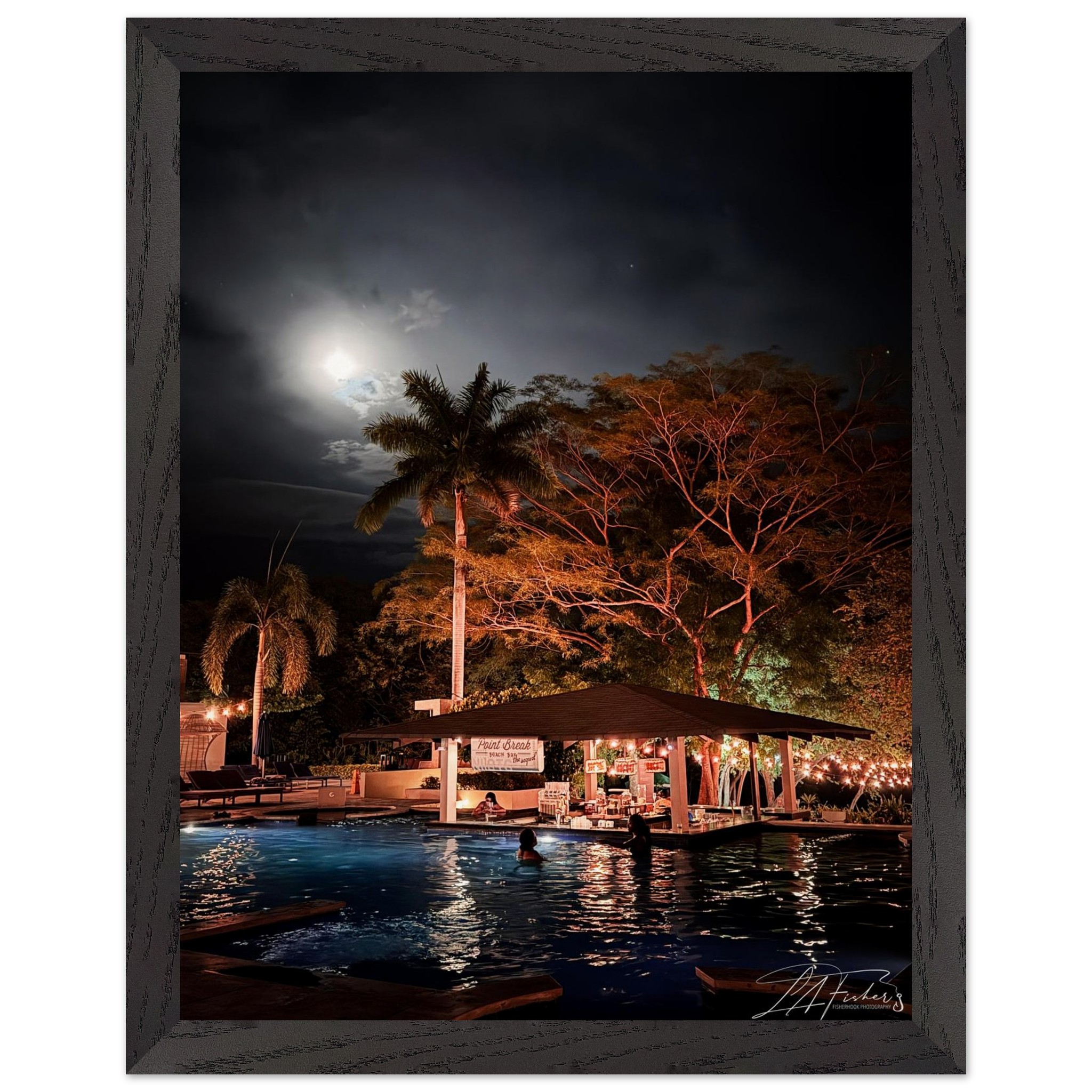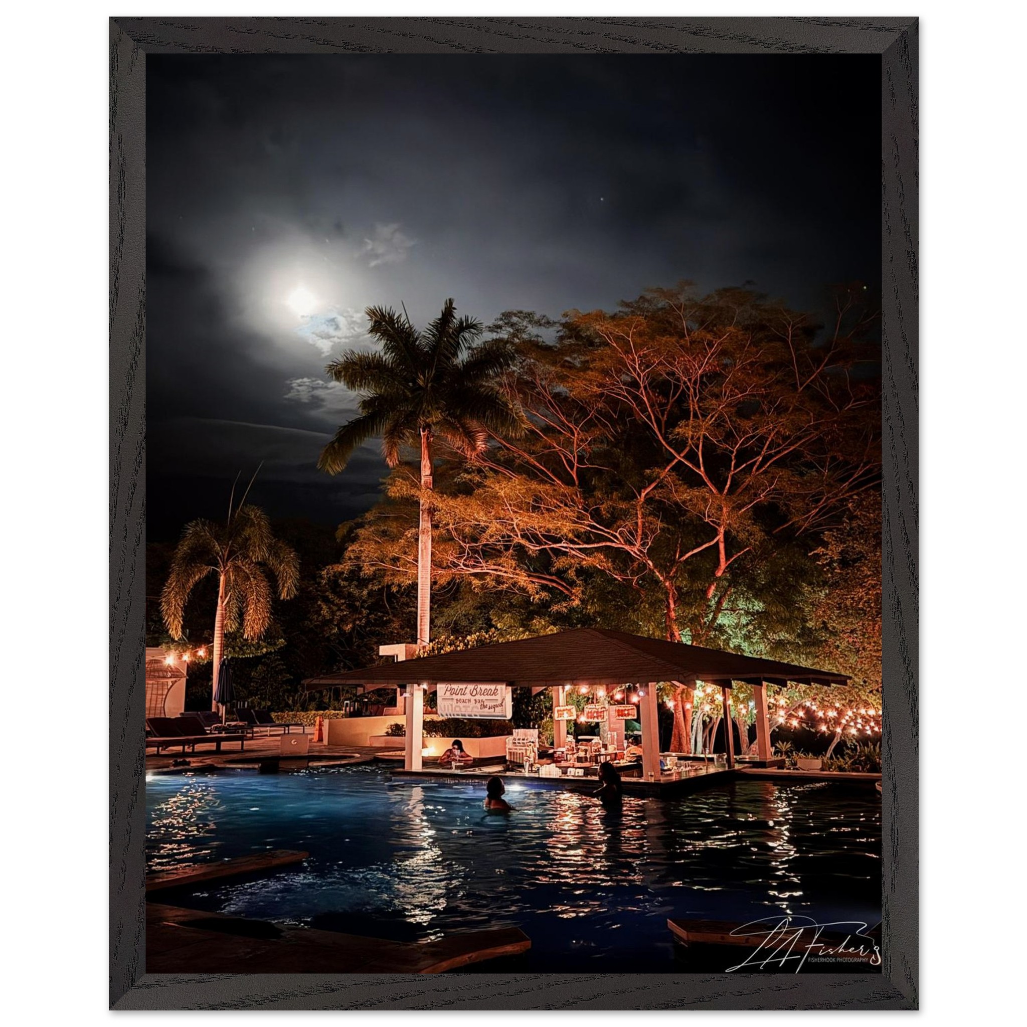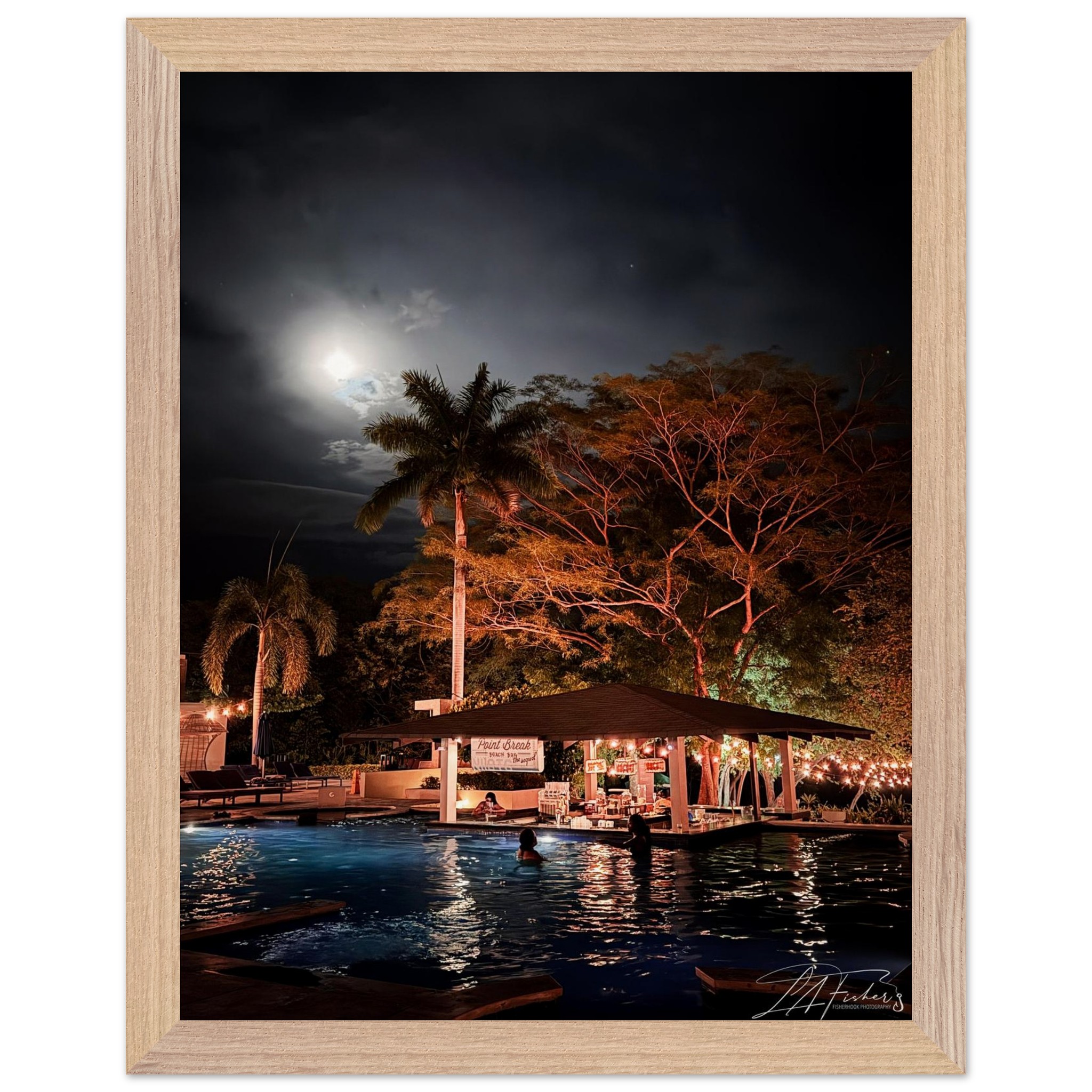 Escape to a tranquil tropical night with our ‘Moonlit Oasis’ framed poster. This captivating piece brings the serene glow of a full moon reflecting on a shimmering pool, surrounded by lush palm trees and the warm ambiance of string lights, right into your home. It’s an invitation to unwind, evoking the peaceful luxury of a perfect evening getaway.