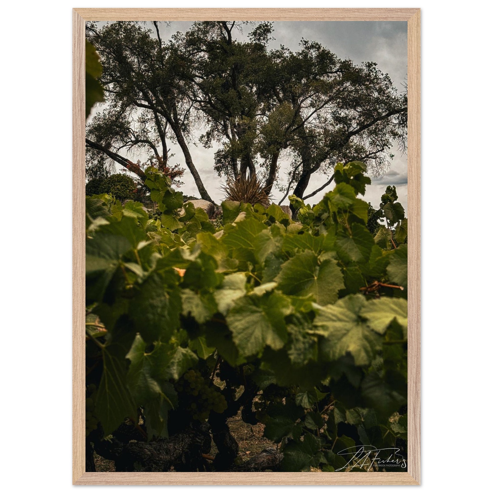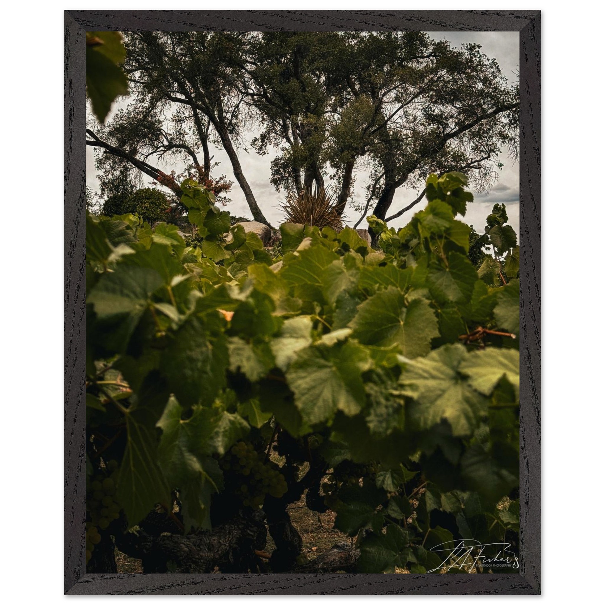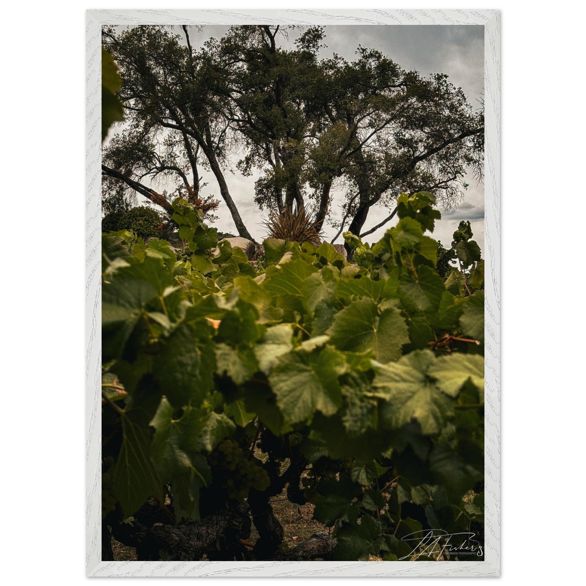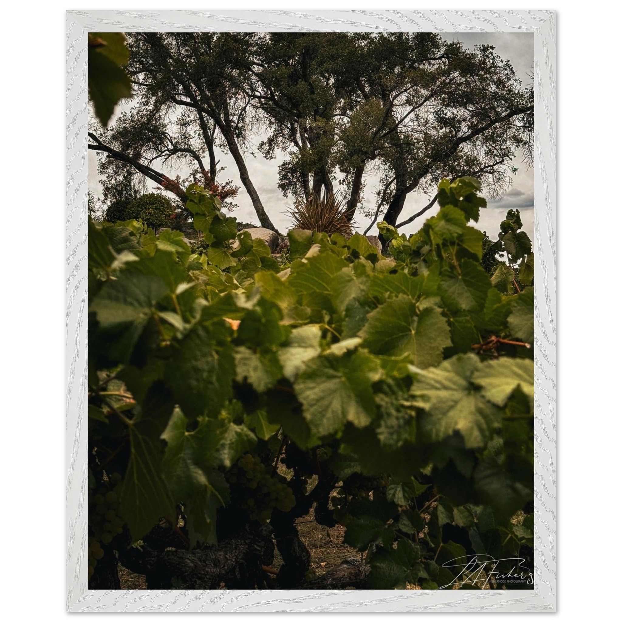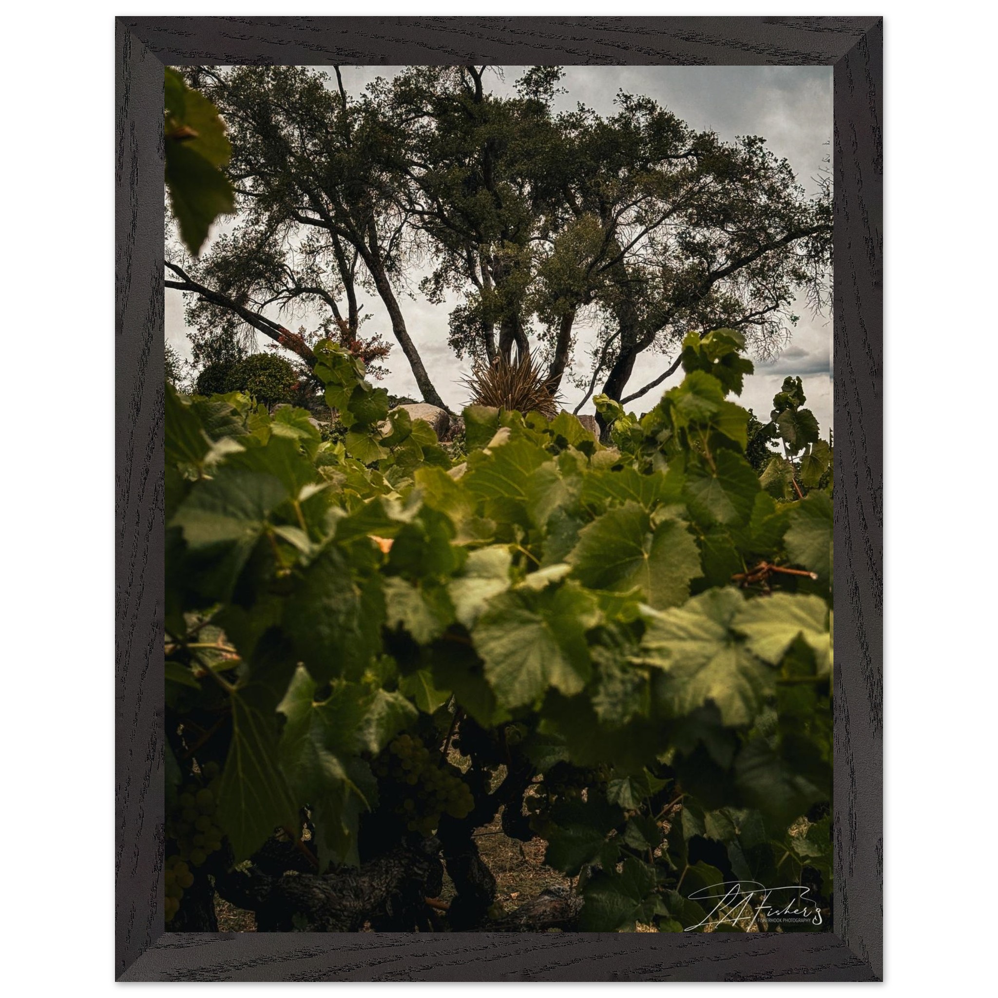 Step into the tranquil beauty of a vineyard, where lush green leaves frame a captivating view of ancient trees under a soft, overcast sky. ‘Vineyard Vista’ captures the essence of nature’s enduring charm and the peaceful rhythm of the land, inviting a sense of serenity and timeless elegance into your space. This piece is perfect for those who appreciate the quiet grandeur of natural landscapes and wish to bring a touch of the countryside indoors.